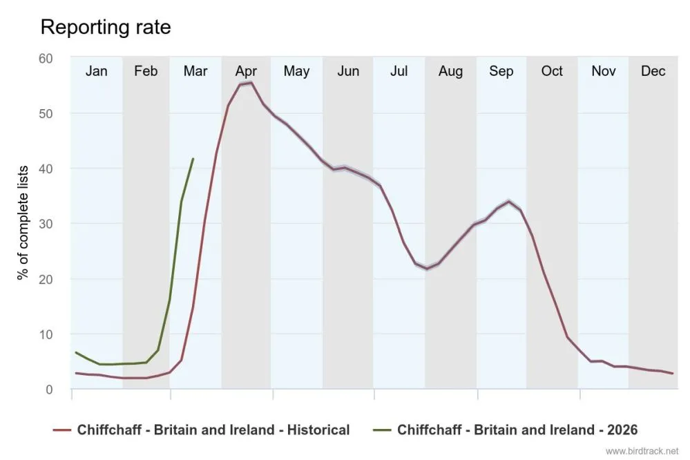 However, by far the most numerous arrival so far has been Chiffchaff. Many Chiffchaffs now overwinter in Britain and Ireland, making it hard to measure first arrival dates, but the weekly reporting rate in BirdTrack has already risen from 4-6% during the winter to 41% in the most recent week, showing the scale of the arrival.