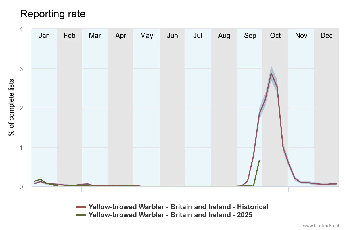 Starting with the common species, Goldcrests arrived in number at some sites, with 260 at Spurn and 185 at Flamborough Head (both East Yorkshire) on 26 September. Goldcrest is the joint smallest British bird, weighing about the same as a 20p coin, yet every autumn several million somehow make the journey across the North Sea from Fennoscandia, often arriving exhausted on our beaches and headlands before finding more typical habitats to spend the winter in.