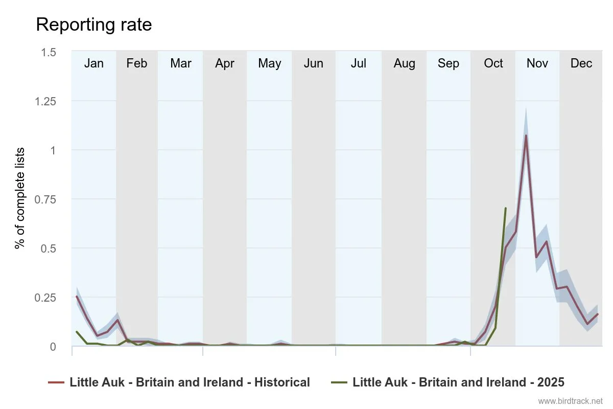 One species which is strongly associated with cold northerly winds in late October is the Little Auk. This tiny Starling-sized auk (the family of birds containing Guillemots, Razorbills and Puffins) breeds mostly on Svalbard and spends the winter in the northern North Sea, but variable numbers are seen in Britain and Ireland each year with a peak in November. There were a good number of sightings on the east coast over last weekend and the early part of this week, pushing the BirdTrack reporting rate for the species above the historical average.