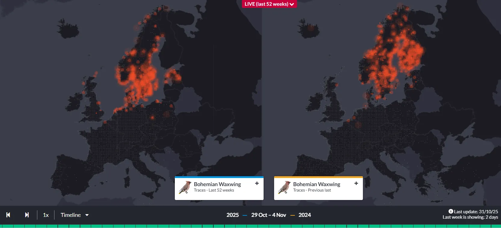Waxwing is always one of the most sought after regular British birds and there have been quite a few sightings in the last week, particularly on Orkney and Shetland, although a few have also made it further south. Waxwing is an irruptive species, moving in search of food, and the numbers that reach Britain and Ireland each winter vary depending on the berry crop further east in Fennoscandia. The EuroBirdPortal is a great project that brings together data from bird recording platforms across Europe to map the weekly occurrence of different species across Europe and can help us predict whether this will be a ‘Waxwing winter’. The map on the left below shows records of Waxwings over the last two weeks, while the map on the right shows records in the equivalent weeks in 2024. Although the maps are not directly comparable, as we don’t have the latest data from Finland, it’s clear that there are already more Waxwings further south and west this year, particularly in southern Scandinavia, so this may be a sign that this winter could at least be better for Waxwings here than last year!
