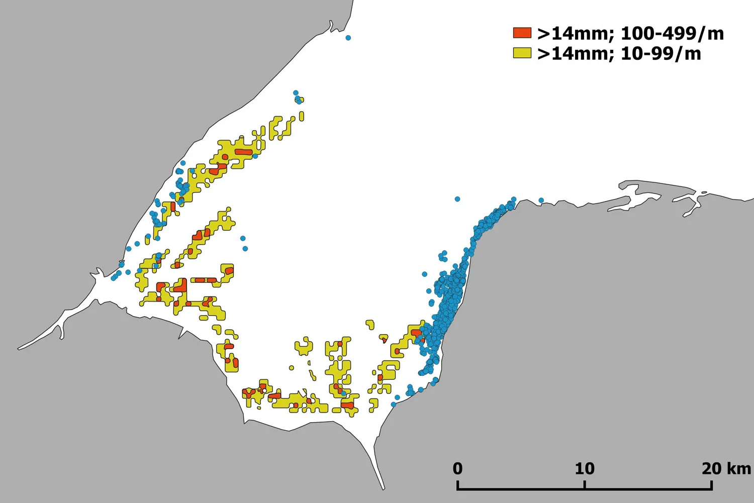 Locations (blue) of tagged Oystercatchers in relation to cockle beds (yellow and red).