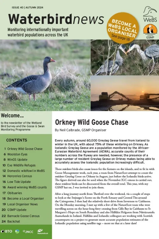 Waterbird News, the newsletter of the Wetland Bird Survey and the Goose & Swan Monitoring Programme, is produced annually to give counters updates on what has been going on, primarily in WeBS, but also in the wider world of waterbird conservation. (Waterbirdnews used to be called WeBS News.)