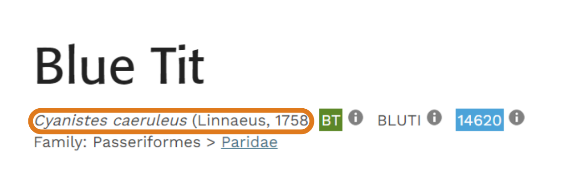 The species’ scientific* name is shown in italics underneath the English name. Scientific names comprise two parts: a generic name, which refers to a small group of closely related species, and a specific name. Together, these two names uniquely identify the species. For example, the scientific name for Blue Tit is Cyanistes caeruleus.
