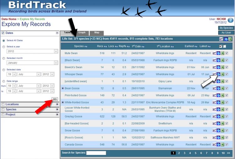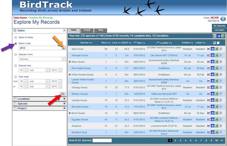 To view your year lists, select 'Year' from the ‘Dates’ filter (1). Next, use the dropdown menu from 'Years' to select the year – the current year is the default setting. Once you have selected the appropriate year select 'Table-View/download records' from the 'Output' field (2) and click 'Create Output' (3) to display your life list in the table. The number of species recorded is shown at the top left of the table (red arrow).